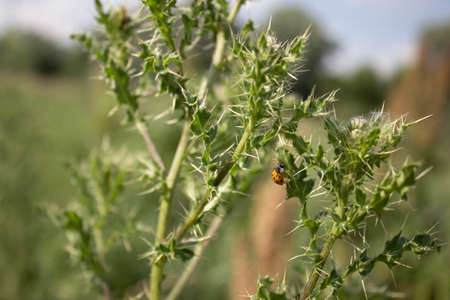Field grass blossom with thorns and ladybug close-up, artistic selective focus macrophoto