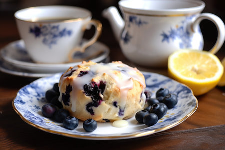 a scone, covered in blueberry and lemon fillings, with a teacup on the side, created with generative ai