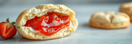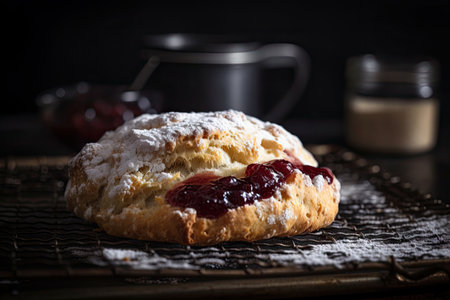 oven-baked scone with sweet strawberry jam and a sprinkle of powdered sugar, created with generative ai