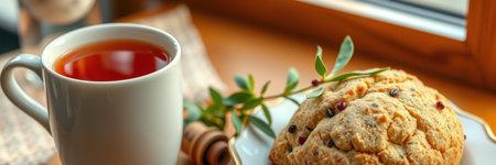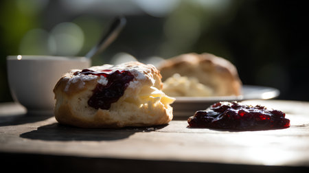 Escape into a cozy afternoon tea scene featuring warm scones, decadent clotted cream, and sweet berry jam This captivating image evokes relaxation and simple luxury A steaming cup of tea completes the tempting spread, promising exquisite flavors and textures Indulge your senses and experience the warmth and charm of this AI Generative