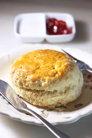 Delicious scones with Strawberry Jam and Clotted Cream on white table. English pastries concept. A scone is a single-serving quick bread, usually made of wheat, barley or oatmeal with baking powder