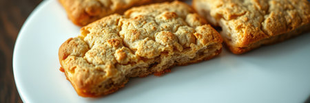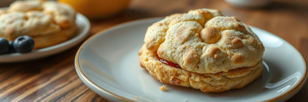 Soft baked treats on a white plate with a rustic wooden background and warm lighting