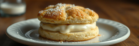 Delicious homemade biscuit layered with creamy filling and powdered sugar on a plate