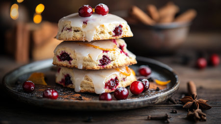 Delicious cranberry scones with icing on a rustic plate surrounded by festive decorations