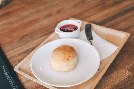 Scones with Strawberry Jam on white plate, Traditional English afternoon tea. copy space for text, selective focus.
