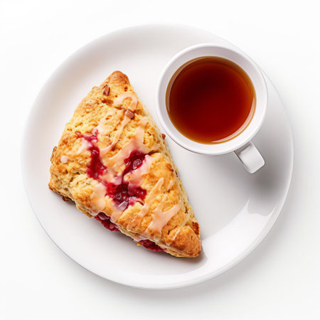 raspberry scones, freshly baked and perfectly imperfect, are arranged in an uneven row alongside a steaming cup of coffee, inviting a cozy morning moment, captured in a bright and airy top view against a crisp white background, evoking feelings of warmth and comfort. ai generated