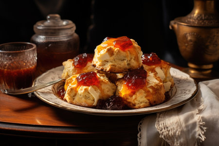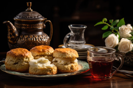 A classic English tea spread featuring scones, clotted cream, jam, and a steaming pot of tea. Generative AI