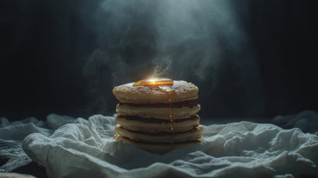 Warm fluffy pancakes are meticulously stacked, glistening with syrup, creating a cozy kitchen atmosphere with gentle steam rising.