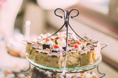 Sweet dessert table at a wedding.Cakestand at a wedding day