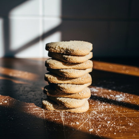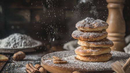 A warm and inviting image of a stack of cookies dusted with powdered sugar, set on a rustic table. The soft lighting and vintage feel are perfect for themes related to baking, comfort food, and nostalgia.