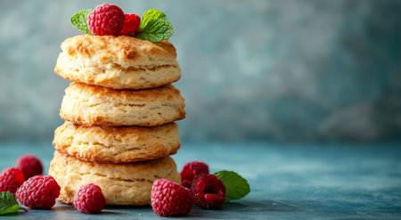 Fluffy raspberry scones are stacked elegantly on a vibrant blue surface, adorned with fresh raspberries and a sprig of mint, highlighting a tempting dessert.