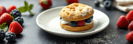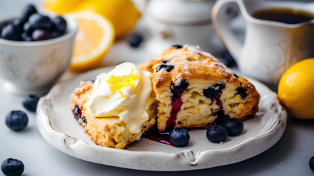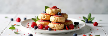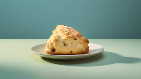 Delicious homemade scones topped with fresh berries and mint on a white plate. That the image is generated using AI.