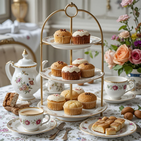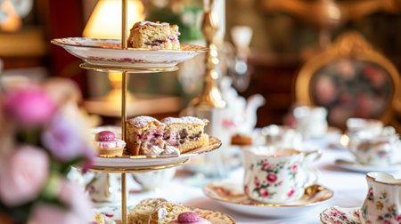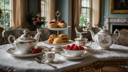 Elegant afternoon tea setting with pastries and teaware in a luxurious parlor