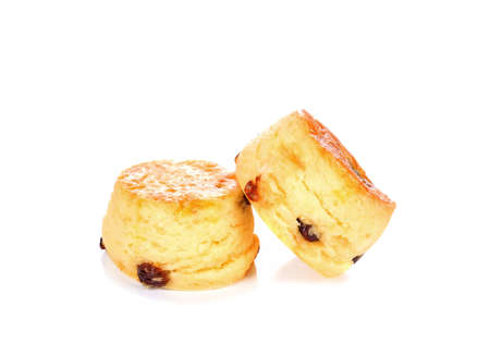 Scons with dried cranberry pieces on baking paper. Close up view. Individual round-shaped bread roll, typical of UK cuisine. Focus on foreground