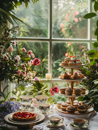 A classic high tea setup featuring a three-tiered dessert stand filled with assorted pastries, tartlets, and scones, complemented by fine china teacups, all set against a backdrop of lush greenery and natural light.