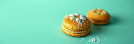 Deliciously crafted pastry with delicate flower decoration on a turquoise background