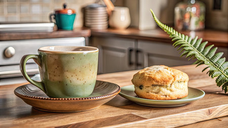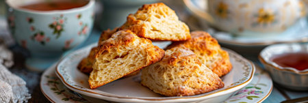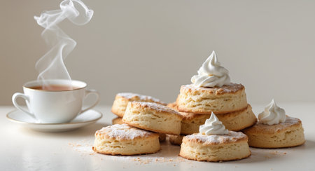 Delightful afternoon tea with scones and cup of steaming tea in a cozy, sunlit setting