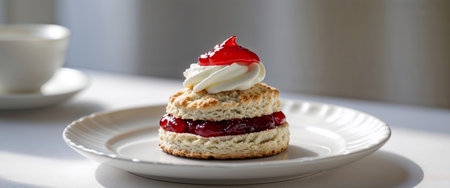 AI Generated. Delicious scone with jam and clotted cream on white plate for afternoon tea concept