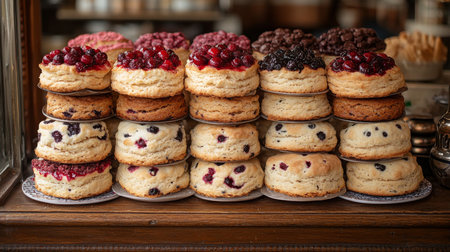 Delicious assortment of freshly baked scones with fruit toppings displayed in a cozy bakery setting in the late afternoon. Generative AI
