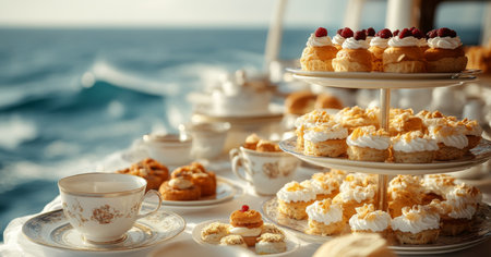 Enjoying afternoon tea on a boat with a spread of delicious pastries and scenic ocean views during golden hour. Generative AI