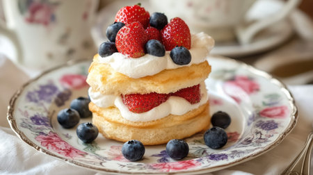 Soft and fluffy fruit sandwich with blueberries, strawberries, and cream, served on a vintage floral plate, cozy setting