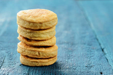 Stacked homemade biscuit sweet cookie on rustic wooden table