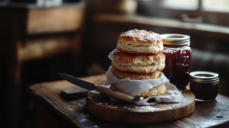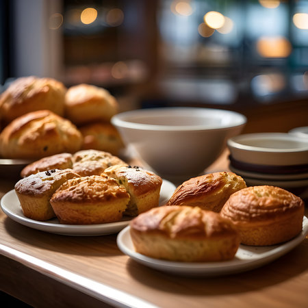 a plate of scones, captured in the painterly style of tokina opera 50mm f14 ff lens, is placed on a table alongside various other dishes. the snow scenes, with their light silver and light amber hues, add a touch of elegance to the composition. the molecular structures of the scones are beautifully highlighted by the dramatic play of light and shadow. ai generated