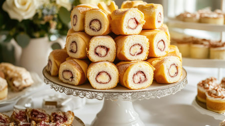 Sponge cake rolls with a variety of fillings displayed on a tiered serving tray at a tea party.