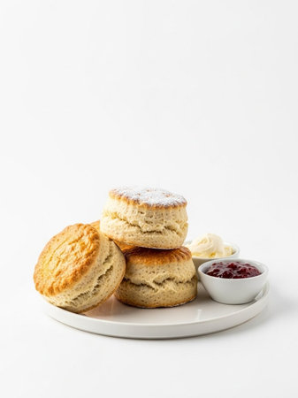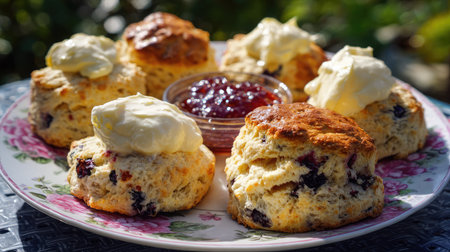 A plate of freshly baked fruit scones served with clotted cream and jam, a quintessential treat for afternoon tea.