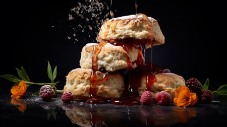 scones with sugar and jam being poured on a black plate, captured in a meticulous photorealistic still life style. the image showcases colorful turbulence and high dynamic range, creating a realistic still life with dramatic lighting. shot with a zeiss ikon zm, the dark pink and brown hues add to the visual appeal. rtx on. ai generated