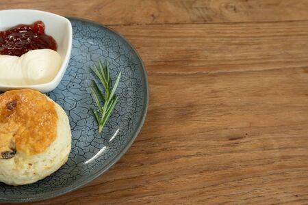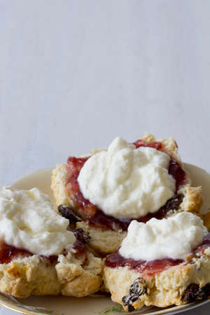 Sultana Scones with Jam and Cream on Plate with Copy space