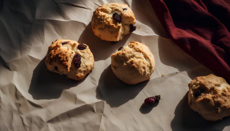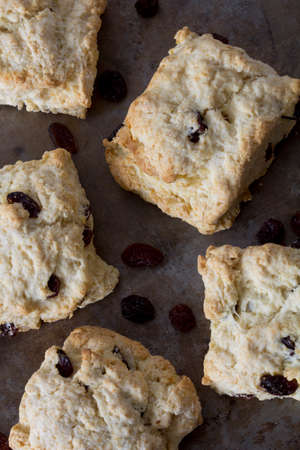 Scones with raisins and cranberries on baking paper