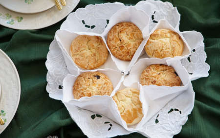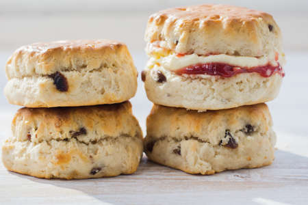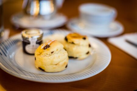 English cream tea, scones close up with raisins or sultanas, british cornish pastries