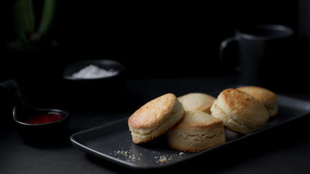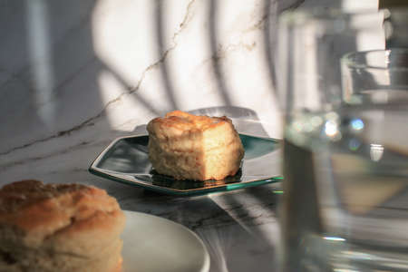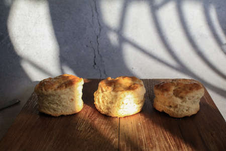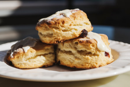 Homemade sweet scones on plate under morning sunlight. Fresh yummy tasty delicious English pastry for afternoon