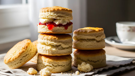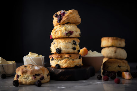 scone tower, stacked high with scones and toppings, created with generative ai