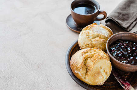 Coffee americano, fresh buns and jam. Simple breakfast in morning. Rustic style.
