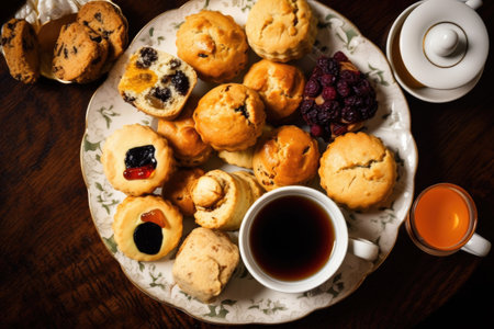 a plate of mini scones and muffins, accompanied by a selection of tea bags, created with generative ai