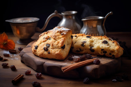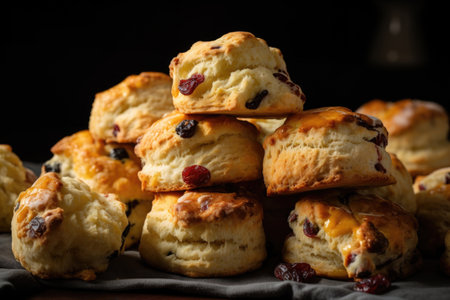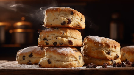 Delightful Scone raisin baked. Baked sweet bread butter biscuit. Generate Ai