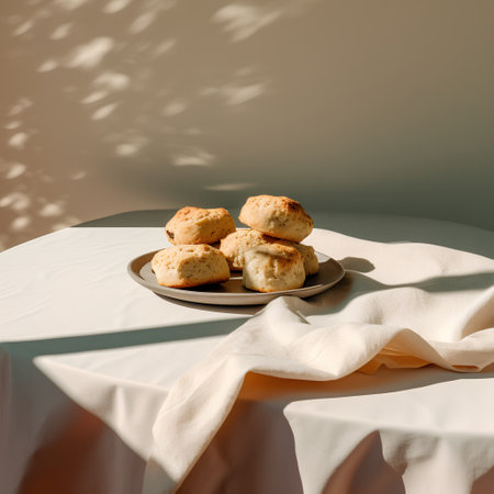 Scones on a plate on a white tablecloth in the sunlight