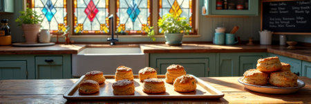 Rustic kitchen with scones on wooden table and stained glass windows. That the image is generated using AI.