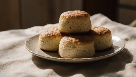 A stack of freshly baked scones sits on a plate, illuminated by natural light, showcasing their golden-brown crust and inviting texture.