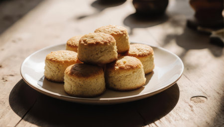 A stack of freshly baked scones sits on a white plate, illuminated by warm sunlight, creating a cozy and inviting scene.