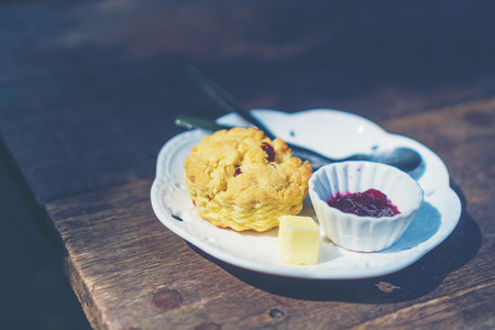 Scones serve with homemade currant jam under sunlight. Fresh yummy tasty delicious English pastry for afternoon