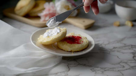 Close up view of a woman putting clotted cream and jam on scone, Traditional British Scones