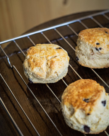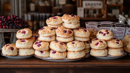 Freshly baked scones with berries displayed on a wooden counter in a cozy bakery during the morning hours. Generative AI