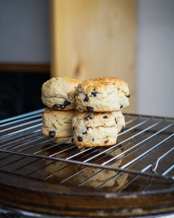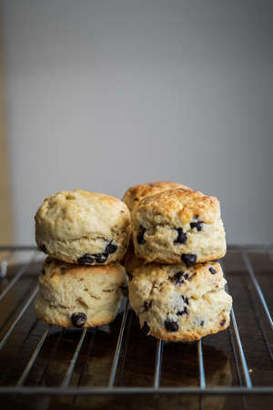Chocolate chip scones on the cooling rack on a wooden background.