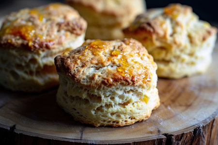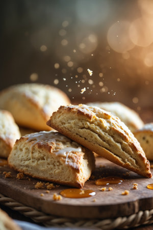 Warmly baked scones with drizzled honey glisten in soft light on a wooden surface