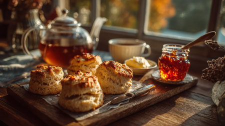 A fresh scone with jam and butter on wooden board near teapot and cup by window create warm cozy cottagecore