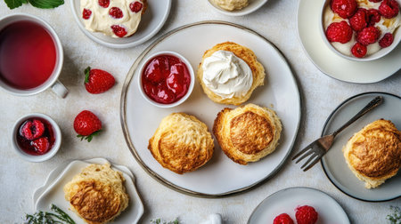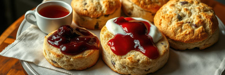 Freshly baked scones with clotted cream and fruit jam served with tea in a cozy setting