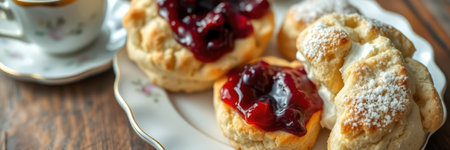 Delicious scones served with jam and cream on a rustic wooden table in a cozy cafe during afternoon tea